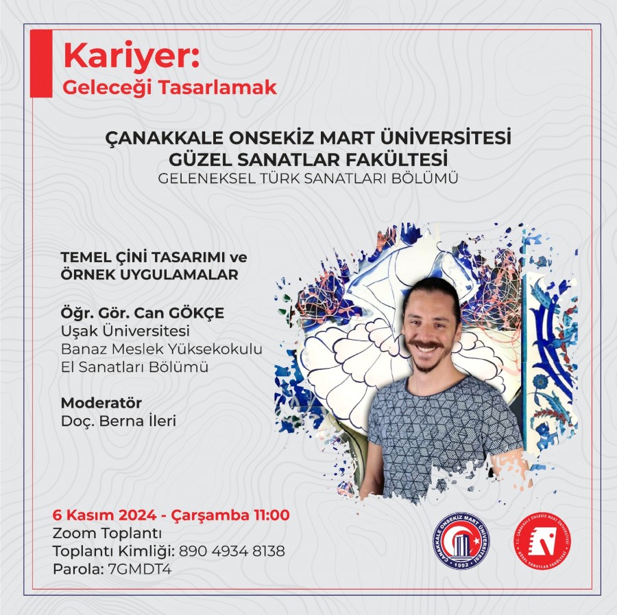As part of the "Career: Designing the Future" presentations, a lecture titled "Basic Design of İzni and Sample Applications" was held in our department. The online presentation, delivered by Lecturer Can GÖKÇE from the Department of Handicrafts at Uşak University Banaz Vocational School, focused on traditional Turkish motifs such as leaf, claw, tulip, and carnation. It included examples of drawings and practical applications related to creating compositions using these motifs. Can Gökçe also shared examples of his own design works. The lecture was attended by students and faculty members from the Department of Traditional Turkish Arts. We would like to express our gratitude to Lecturer Can GÖKÇE for his insightful presentation.