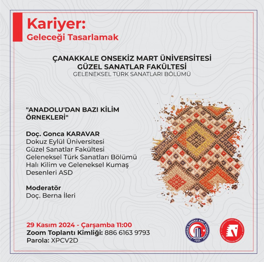 An online presentation titled “Some Examples of Kilims from Anatolia” was held in our department as part of the “Career: Designing the Future” series. Delivered by Assoc. Prof. Gonca Karavar from the Traditional Turkish Arts Department at Dokuz Eylül University Faculty of Fine Arts, the presentation covered the weaving techniques, motifs, and compositional features of kilims. Additionally, examples of kilims from various regions of Anatolia were showcased. The presentation was attended by both students and faculty members from the Traditional Turkish Arts Department. We extend our gratitude to Assoc. Prof. Gonca Karavar for her enlightening talk.