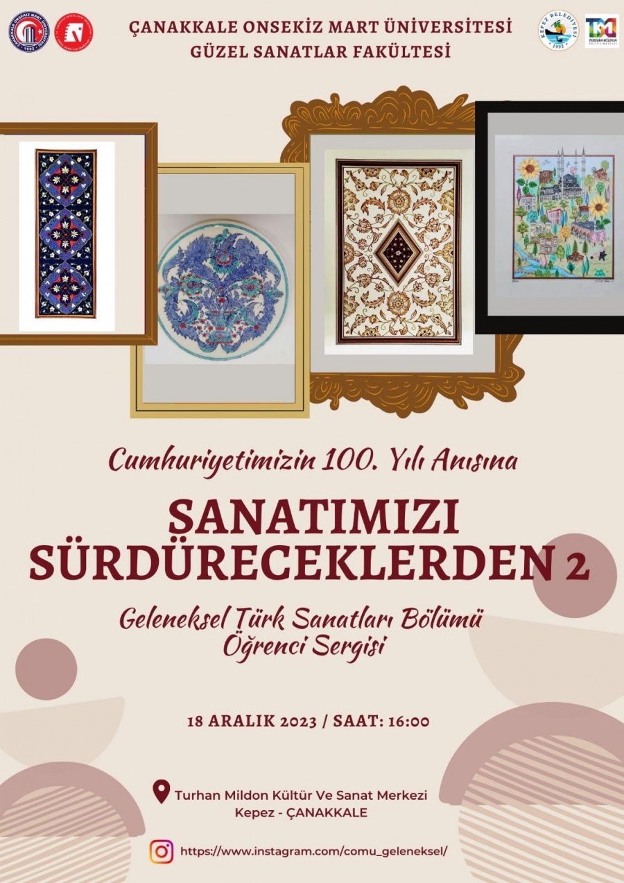 'The exhibition titled 'Sustainers of Our Art 2,' featuring works by students from the Traditional Turkish Arts Department of Çanakkale Onsekiz Mart University Faculty of Fine Arts, is dedicated to the memory of the 100th anniversary of our Republic. The exhibition will be open for viewing at the Turhan Mildon Art and Culture Center from December 18, 2023, to December 23, 2023."