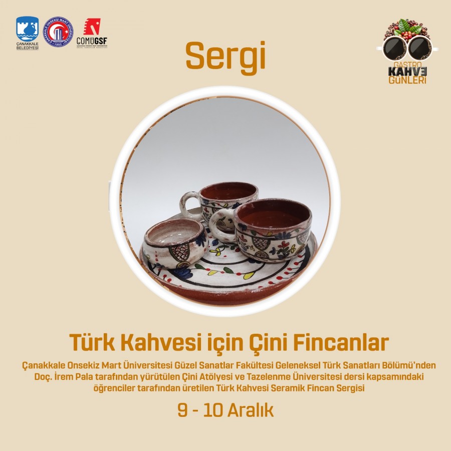 Turkish coffee-themed ceramic cups, created by students under the guidance of Assoc. Prof. İrem Pala from the Traditional Turkish Arts Department of Çanakkale Onsekiz Mart University Faculty of Fine Arts, were showcased on 9–10 December 2024 at the Çanakkale Municipality Cultural Centre Foyer. These works were produced as part of the "Çini Workshop" and courses at the Lifelong Learning University by students Tülin Anayurt, Özel Ayşe Pedük, Ecem Deniz, Leyla Akpınar, Elvan Tabaklıoğlu, Öykü Işık, Vedat Odan, Sevil Tutum, Özlem Çanlı, Naci Biricik, Zerrin Biçmen, Funda Köseoğlu, Bediha Türkdönmez, and Cahide Gonca Çakır.