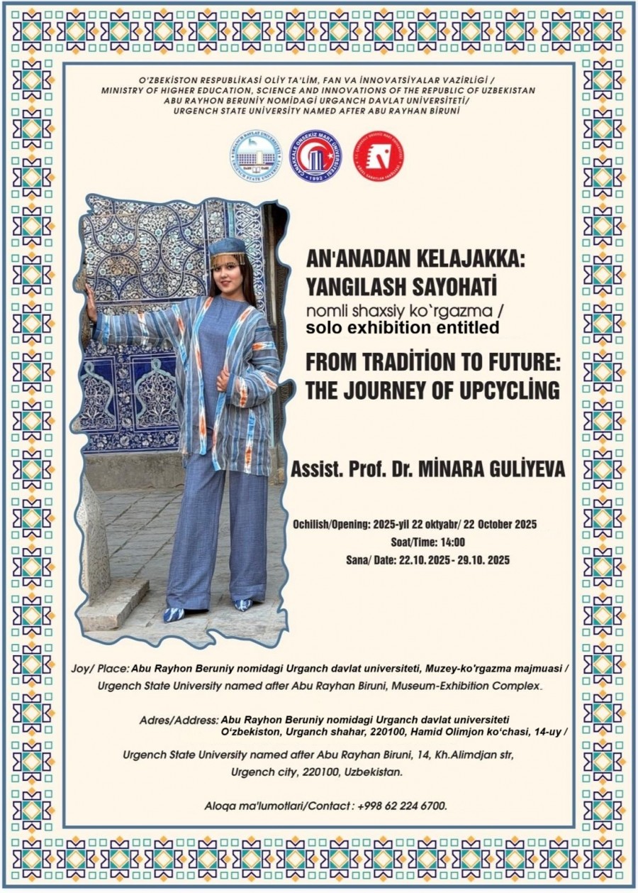 Dr. Öğr. Üyesi Minara Guliyeva’nın “Gelenekten Geleceğe: İleri Dönüşüm Yolculuğu / From Tradition to Future: The Upcycling Journey” adlı kişisel giysi sergisi, 22 Ekim 2025 tarihinde Abu Rayhan Buruni adına Urgench Devlet Üniversitesi Müze-Sergi Kompleksinde sanatseverlerle buluştu.