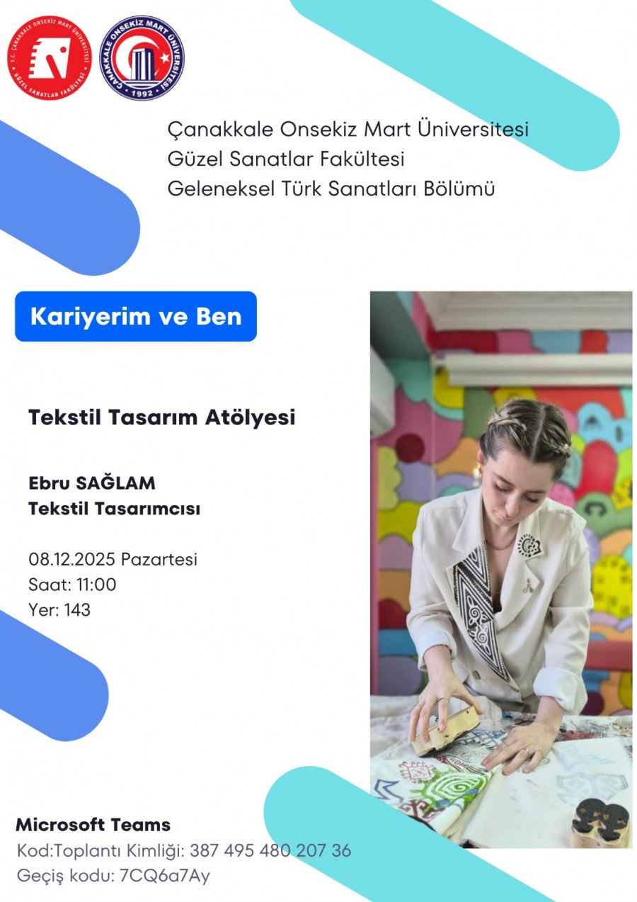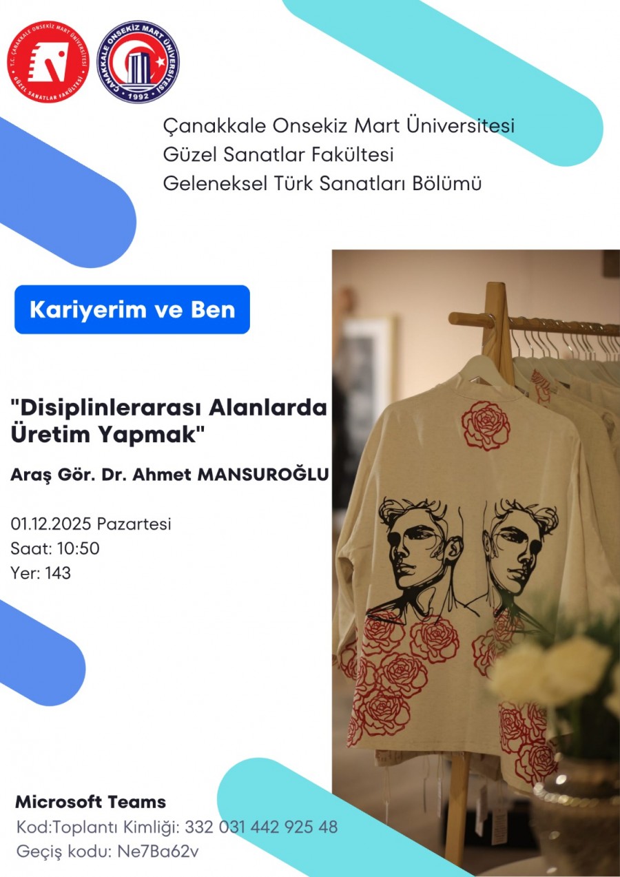 Doç. Berna İleri yönetiminde Kariyer Planlama dersi kapsamında Kariyerim ve Ben etkinliğine bu hafta Arş. Gör. Dr. Ahmet Mansuroğlu konuk olarak katılmıştır. Mansuroğlu, çevrimiçi olacak bu söyleşide "Disiplinlerarası Alanlarda Üretim Yapmak" konusunu işlemiştir.